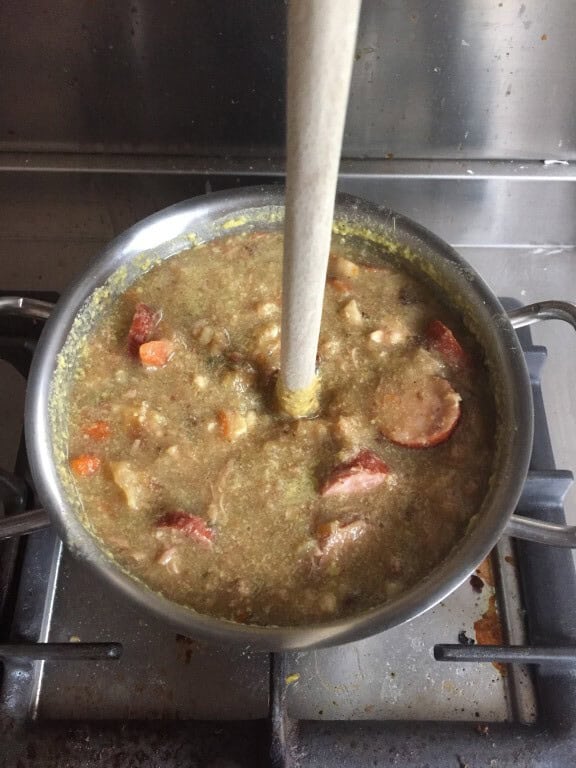 Doe de erwten , het water, de bouillonblokjes het spek en het vlees in een grote pan en zet dit op een matig vuur. Was, snij, schil etc. de groentes en snij ze in niet al te grove stukken (dobbelsteentjes). Voeg dit alles toe aan de soep en laat dit 3 uur zachtjes koken. Voeg de gewassen en gesneden bladselderij, de twee in schijfjes gesneden rookworsten en wat zout en peper toe. Laat dit alles nog 1 uur zachtjes koken.